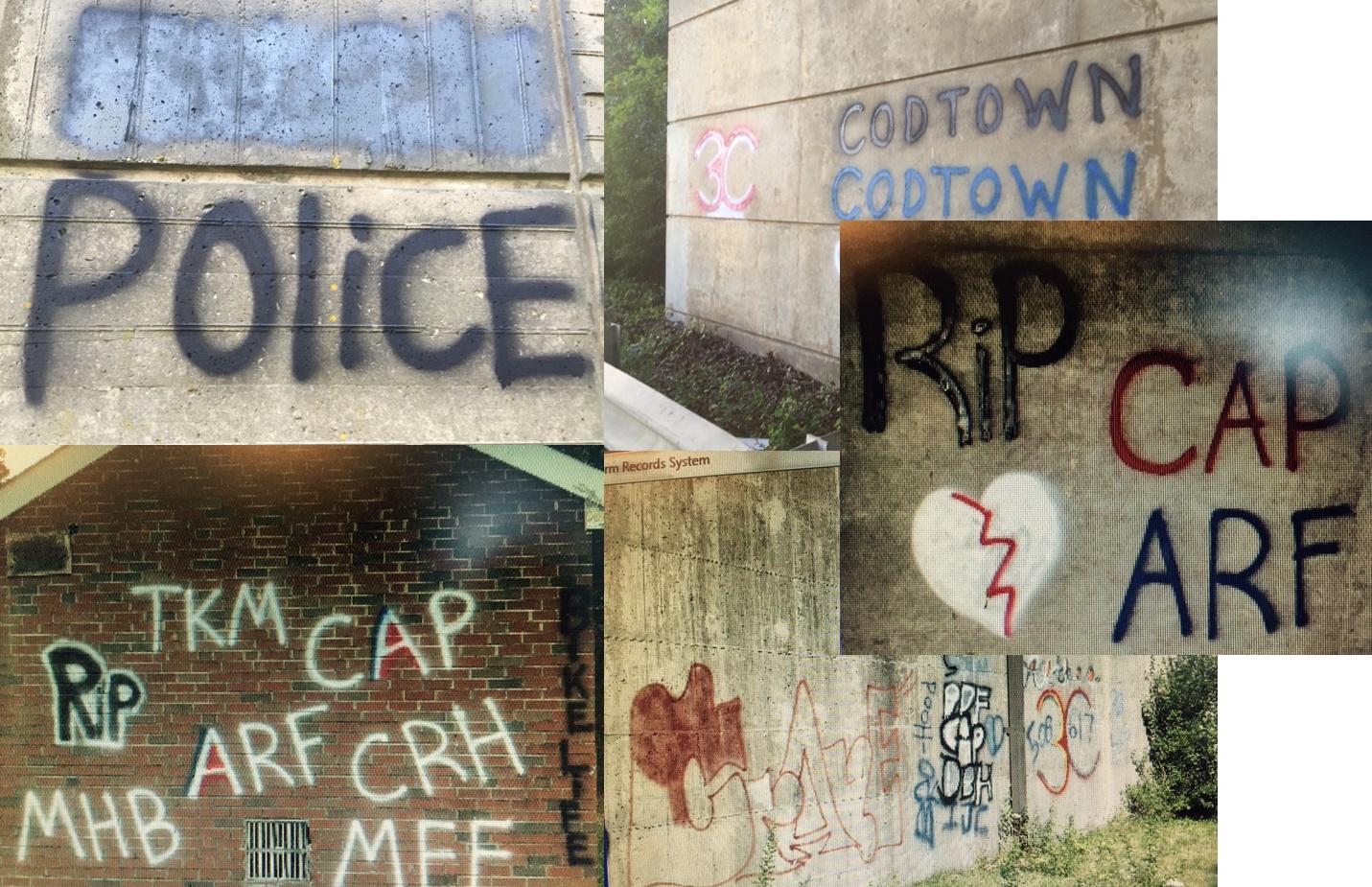 On September 2, 2015 Patrol Officer Geary went to the Town of Yarmouth Water Pump Station on North Main Street for the report of more graffiti. It appeared that the graffiti at this location was similar in nature. There were more initials “TKM” “CAP” “ARF” “MHB” “MFF” “CRH” along with another “3C” “CodTown” and a tag that read “F THE LAW”. Along with this graffiti at this location there was a large “RIP JOB” that appeared to be unrelated. The “RIP JOB” was in black spray paint rather than white and appeared to be different hand writing. Two cans of spray paint were located at this location and were sent to the Barnstable County Sheriff’s Department Crime Scene Unit for processing with negative results.