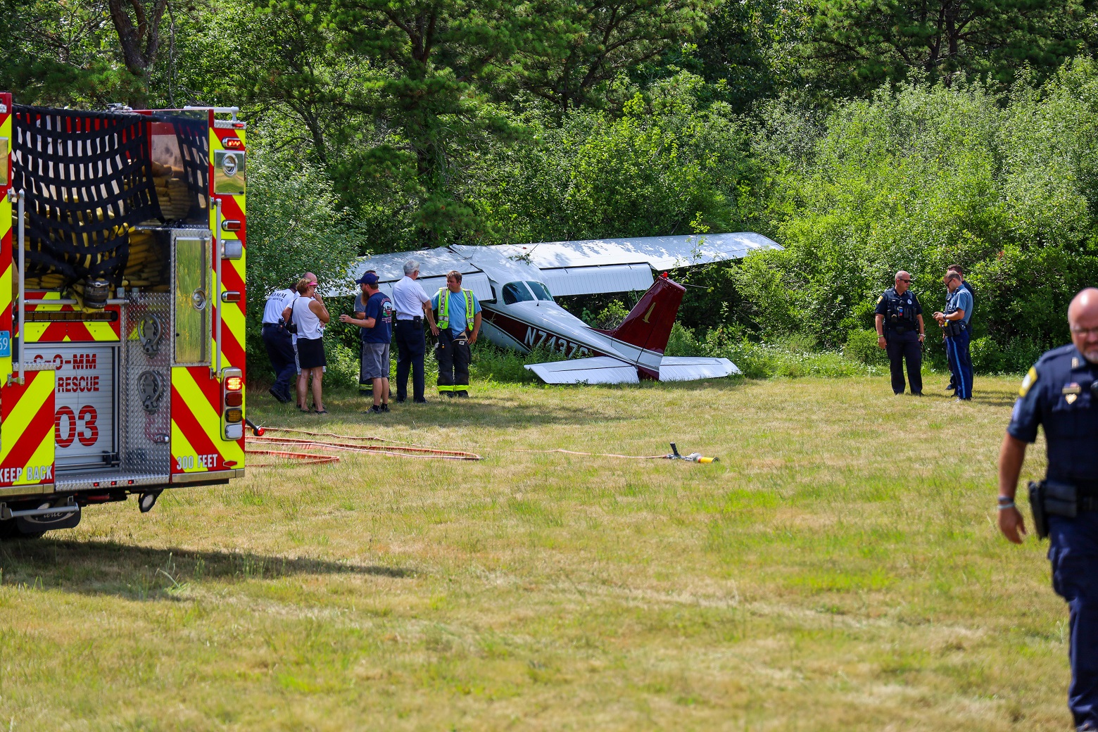 MARSTONS MILLS – At about 2:15 p.m. today, police and firefighters sped toward the Cape Cod Airfield for a report of a plane crash into the woods at the end of one of the runways. HN spoke with a police official on scene and confirmed that there were two people onboard and that they escaped without injury.