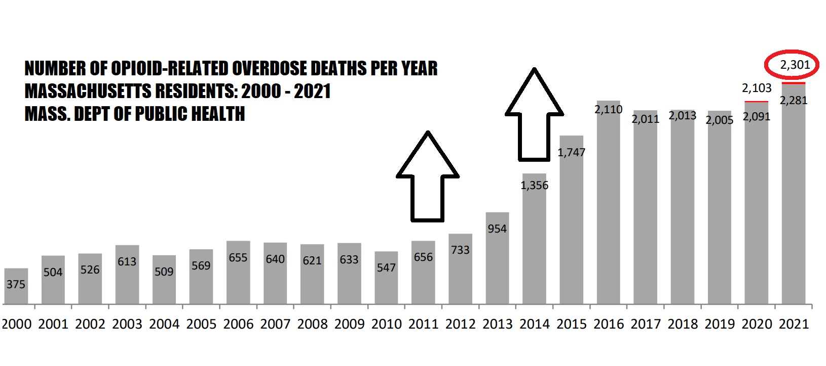 Nearly four decades later, the so-called Fentanyl Epidemic is now being referred to as a national “crisis.” Drug overdoses here on the Cape do not appear to be slowing… at times it seems to be getting much worse. In fact, Massachusetts Department of Public Health statistics show a steady increase in the number of statewide yearly overdose deaths between the years 2000 and 2021 (see following graph). Note, the current data does not yet show the number of deaths in 2022 and 2023. Also, current local statistics were unavailable at the time of this report. In HN’s opinion, it’s important to talk about and share these numbers…