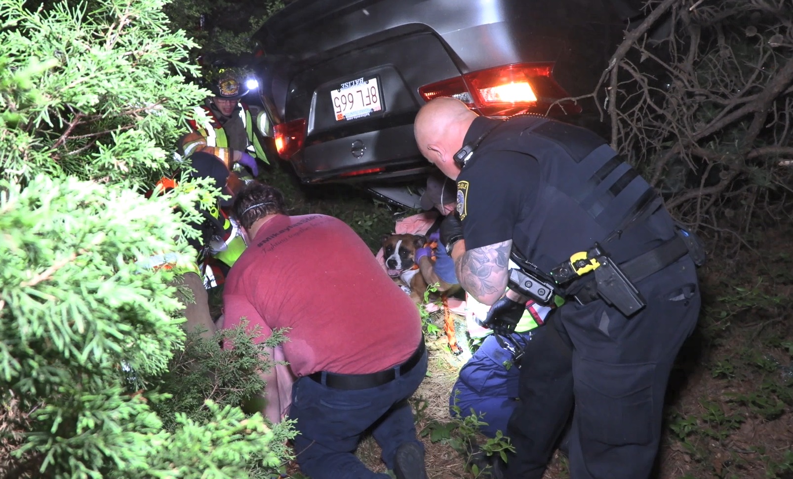 *** WATCH *** Police and firefighters rush into woods to extricate woman and her dog from overturned vehicle…