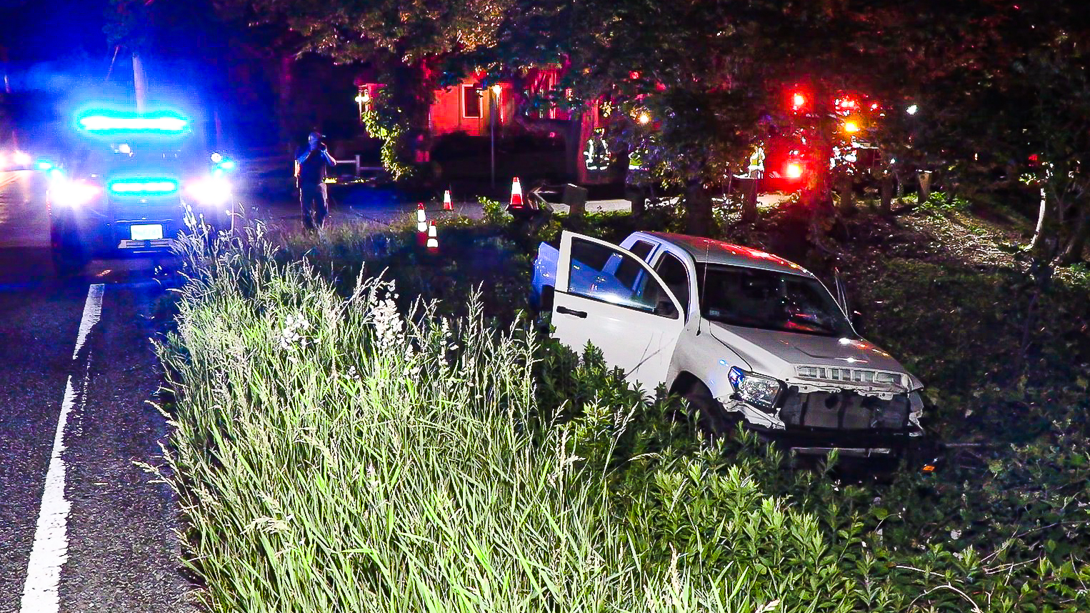 Shortly after 9:00 p.m. – Tuesday evening – police and firefighters arrived at the intersection of Route 6A and Maple Street to find a white Toyota Tundra pickup truck with front end damage… disabled in a ditch, after it apparently had just crashed through some decorative fencing and a metal guardrail.