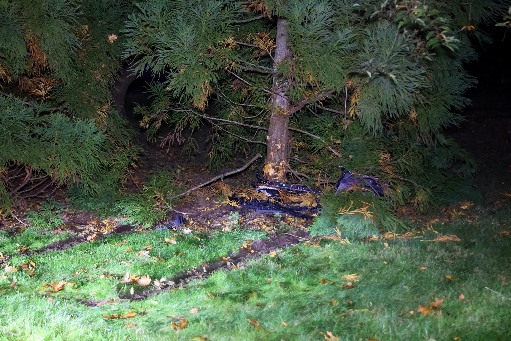 The Audi sedan had substantial damage from slamming head-on into the well-rooted Japanese Cedar. A source on scene said the tree appeared to be a Japanese Cryptomeria (and according to online photos, that appears to be an accurate assessment). There are a number of slightly differing varieties of Japanese Cryptomeria, and the tree’s popular hardwood is often used in construction and furniture projects back in Japan. The tree’s name “Cryptomeria” comes from the Greek words “krypt,” which means to hide, and “meris,” which means “a part,” according to online sources. These hardy trees are often used as screens and border plants.