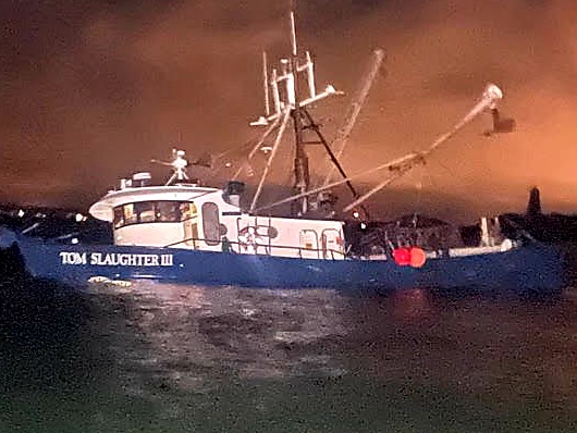 UPDATE – 9/29/2021: In a Tweet, U.S. Coast Guard Station Woods Hole reports one of their 45-foot RB-M boat crews successfully rescued 4 people aboard the grounded fishing vessel Tom Slaughter III after it began taking on water about a half mile south of Yarmouth. No injuries or pollution reported. Owner working to have vessel salvaged. [USCG photo/HN edits]