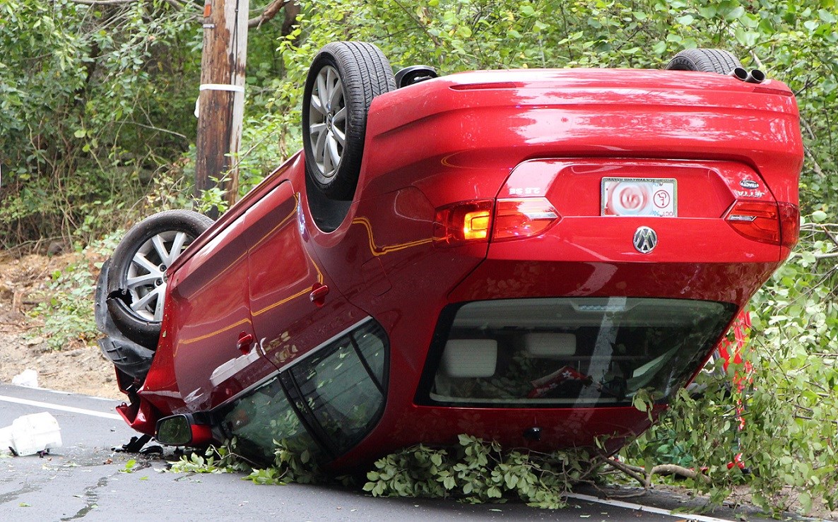 The VW was traveling South on Oak Street when it somehow veered off the road and struck a large tree before rolling over.